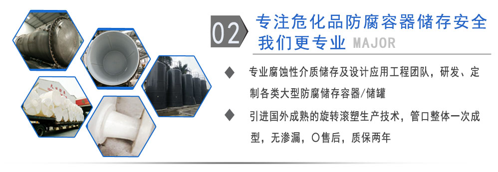 公司有鋼襯塑PE/PO、PE全塑、碳鋼、不銹鋼四大系列100多個品種,專注于常壓儲存容器生產,其產品包括鋼襯塑儲罐、管口一體成型PE儲罐碳鋼儲罐不銹鋼儲罐、反應釜、攪拌罐、離子交換柱、鋼襯PE/PO儲罐、塑料儲罐、鹽酸儲罐、硫酸儲罐等等。更大限度滿足廣大客戶的各種需求,同時可以根據客戶的需要加工定制各種防腐設備。